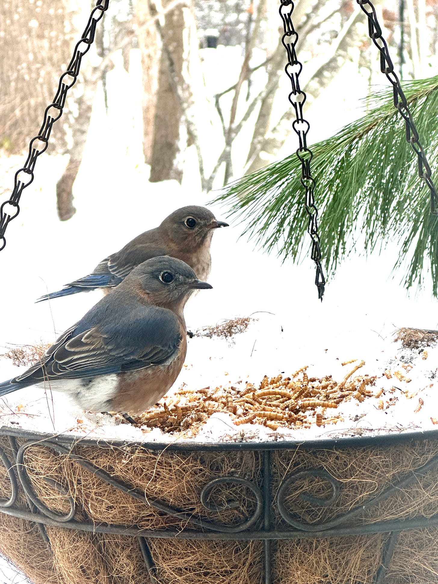 Female bluebirds enjoy mealworms from a coco coir hanging planter, Ridge, NY. Photo by Bugchik (on Instagram)